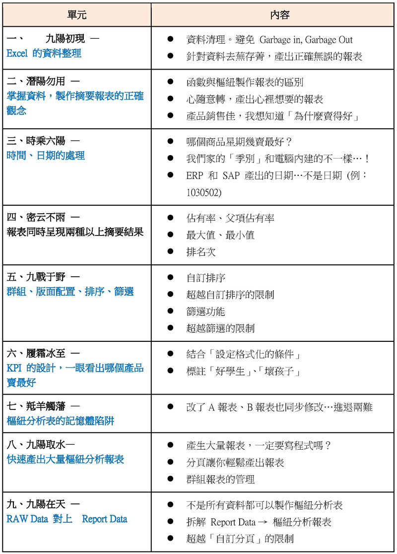 擁有大筆資料不見得有用,重要的是透視資料背後的意涵,採取對應的決策。 你可能認為「Excel 樞紐分析」很簡單,但其實還有許多隱藏功能,如快速排名次、計算佔有率等等,善用這些技巧,讓你事半功倍地完成報表!掌握目前、過去、未來的營運狀況,隨時透過交叉分析的篩選傳達重要資訊