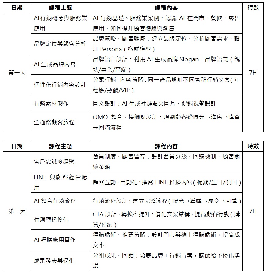 課程旨在帶領學員掌握數位行銷與AI技術的深度融合。從基礎的AI行銷概念出發,涵蓋品牌定位、自動化內容生成到全通路(OMO)顧客旅程規劃。透過兩日密集的實作,學員將學會如何運用AI工具產出高品質的行銷素材、優化轉化率,並建立完善的會員忠誠度體系,實現精準且具個性化的品牌行銷策略。