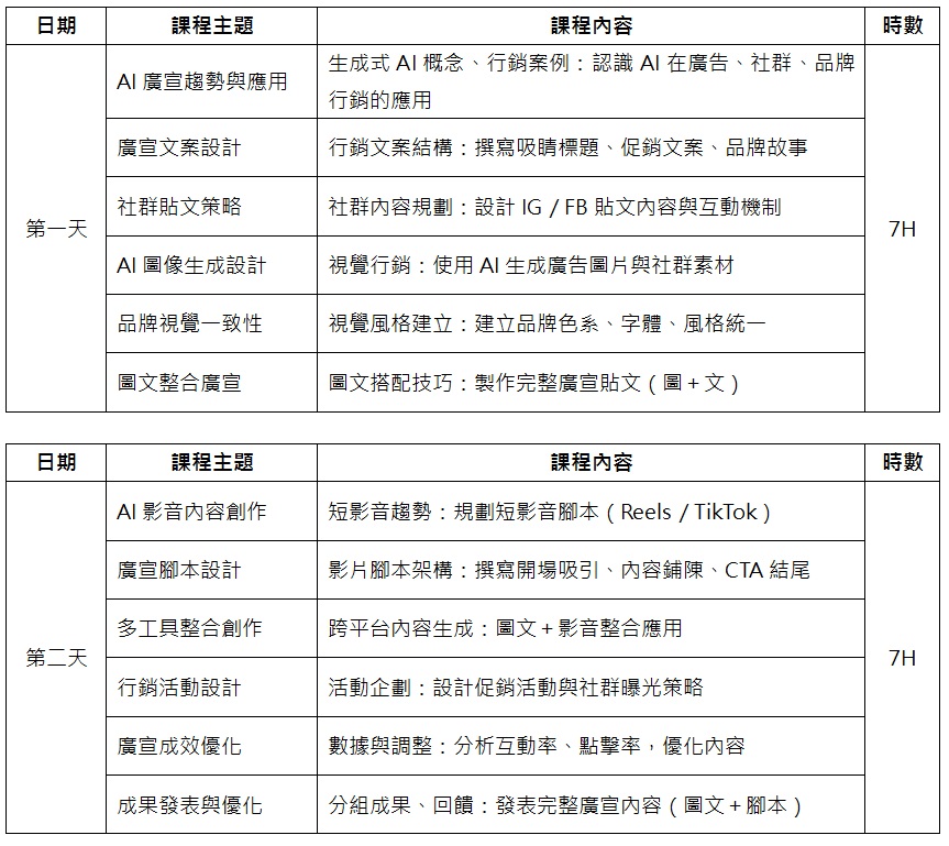 本課程旨在賦能服務業從業人員,掌握新一代數位行銷的核心技術。課程以「AI廣宣內容創作」為核心,深入探討生成式AI如何翻轉傳統行銷流程。透過為期兩天、共14小時的密集實作,學員將學會整合ChatGPT與Canva等主流工具,從基礎的品牌文案構思、社群圖文設計,進階到短影音腳本企劃與跨平台廣告投放策略。這不僅是一場技術教學,更是一次品牌視覺一致化與虛實整合廣宣的實戰演練,幫助學員在碎片化的社群時代中,利用A 達成高效且精準的品牌傳播。