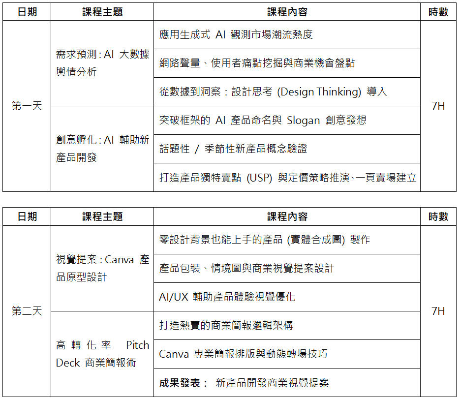 本課程專為服務業人員與銷售主管設計,旨在結合 鑑別式 AI 技術 與 實戰銷售技巧。專為企劃、PM 與創業家設計,從挖掘市場痛點到產出具備說服力的商業視覺提案(Pitch Deck),7 小時(市場調研與概念孵化)+ 7 小時(產品原型與簡報設計)。