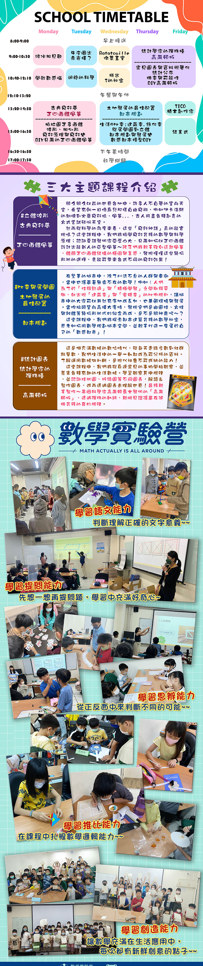 數感實驗室開創以數學內容為主,強調動手做、STEAM跨領域,融入科學、藝術美勞、歷史人文,與生活結合的營隊活動。由專業的數感團隊老師進行教學,適合國小5-6年級學生參加。