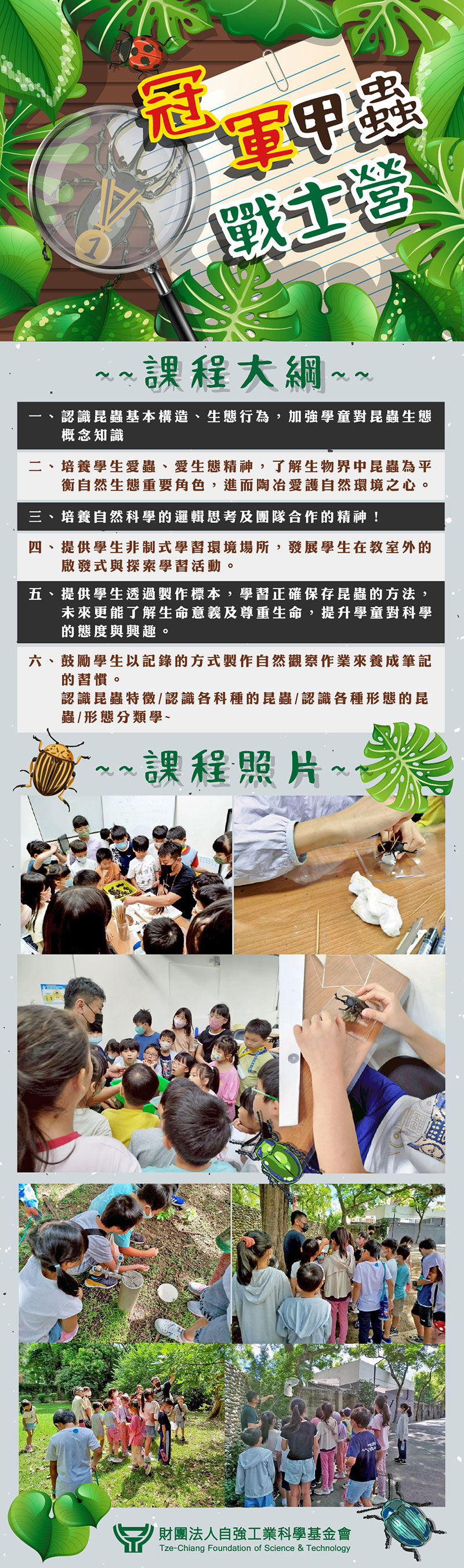 二、培養學童愛蟲、愛生態的精神,了解生物界的昆蟲是平衡自然生態重要角色,進而陶冶愛護自然環境之心。