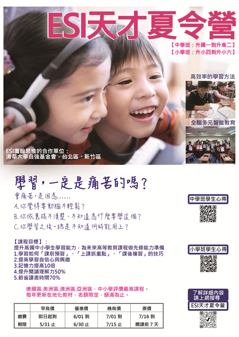 6.長期受外國教育的中學生與小學生,中文的聽、說、閱讀能力具備台灣小五以上的程度即可參加,並由同一位家長全程陪讀,無法配合者切勿報名,我們上課中的舉例皆為台灣中小學課本中的題材,建議報名小學班。本期家長陪讀優惠價12800元。中文聽說讀寫能力在台灣國一以上的程度,就可單獨直接參加中學班。