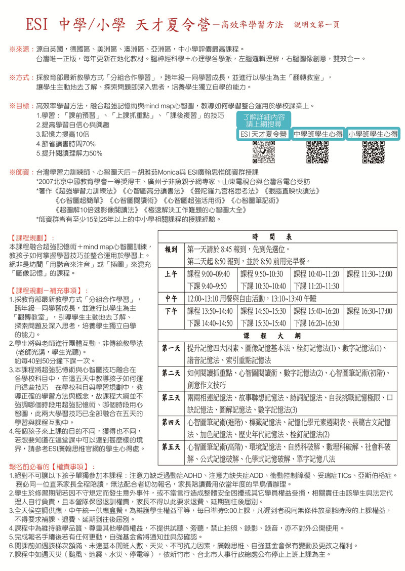 5.本課程將超強記憶術與心智圖技巧融合在各學校科目中,在這五天中教導孩子如何運用這些學習技巧在學校科目與學習規劃中,教導正確的讀書學習方法與概念,故課程大綱並不強調哪個時段用超強記憶術,哪個時段用心智圖,此兩大學習技巧已全部融合在五天的學習與課程互動中。
