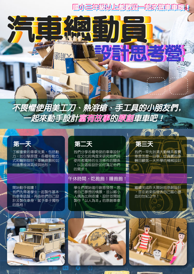 孩子們將學習到有關引擎運作原理、齒輪的構造與功能、汽油的作用、替代性能源、汽車製作過程和生產鏈方面知識,課程以啟發引導,內容多元化外,涵蓋汽車基本概念深入淺出介紹汽車工程技術,最後將也會到清大動機系一樓參觀賽車工廠所展示之賽車,讓理論更具象化。