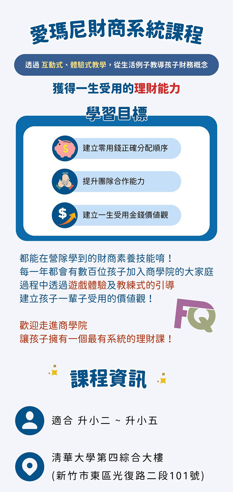 ▹ 最完整的財商教學系統,擁有4~18 歲、家長課程、師資培訓的全方位財商教學系統。