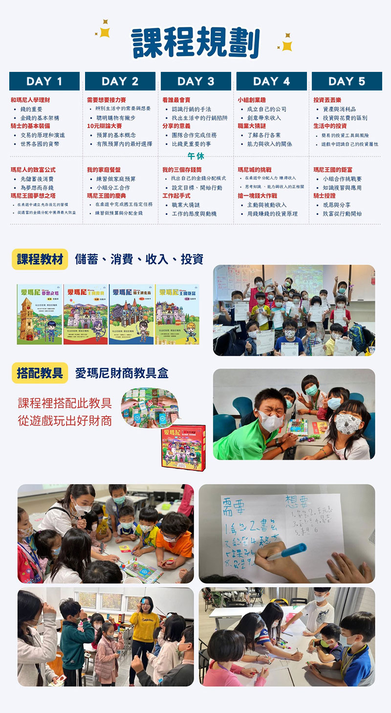 在快速變動的時代中,許多關鍵的價值觀,學校沒有教,但「價值觀」及「習慣」,卻是影響人一生的基石。五到九歲是觀念養成的黃金時期,愈早開發財商潛能,愈能掌握人生,下一個世代的幸福,從現在開始紮根。課程中帶孩子循序漸進,由基本的辨別「需要與想要」、分離帳戶的運用,拓展到貨幣、經濟的觀念、投資的概念與創業的認知。透過互動式體驗教學,讓孩子打好理財基礎,獲得一生受用的財務邏輯!
