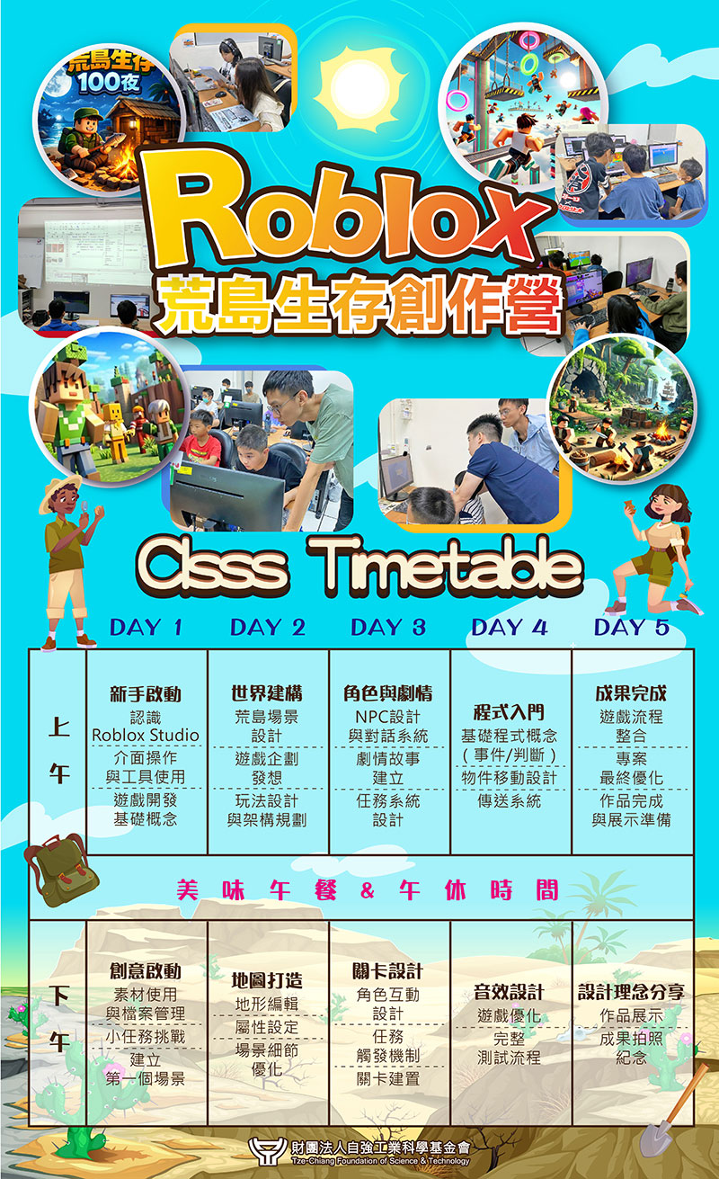 透過Roblox 培養孩子們的核心素養能力,包含「規劃執行與創新應變」、「系統思考與解決問題」、「人際關係與團隊合作」等能力,在培養孩子們基本資訊素養的同時也能將類似概念運用至生活中。提供喜歡玩遊戲或不確定是否對遊戲設計有興趣的孩子,在過程中習得作品相關的基礎遊戲設計概念。
