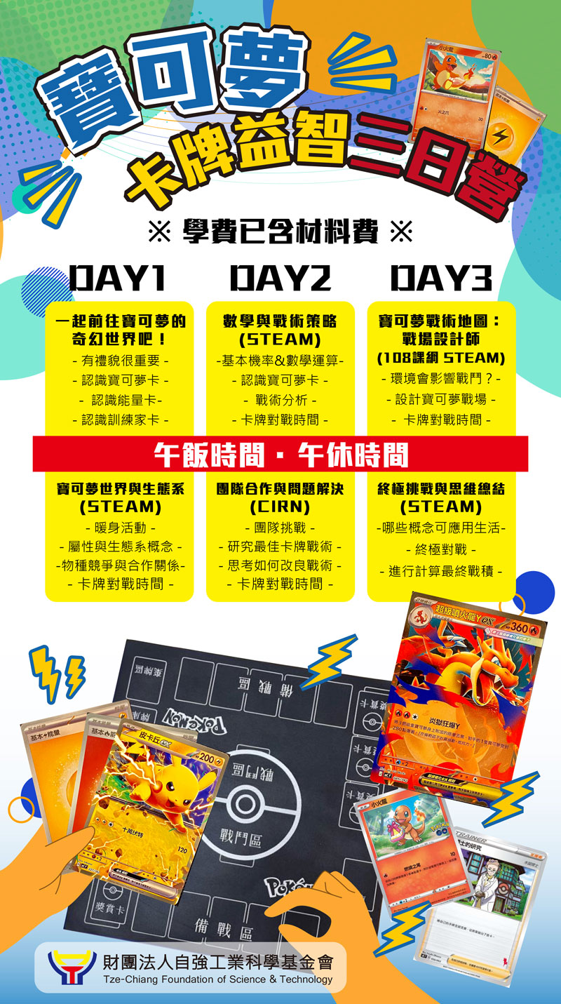 以寶可夢卡牌遊戲主題為營隊主軸,引導孩子們運用策略思考、邏輯思維讓自己的寶可夢戰隊更厲害,