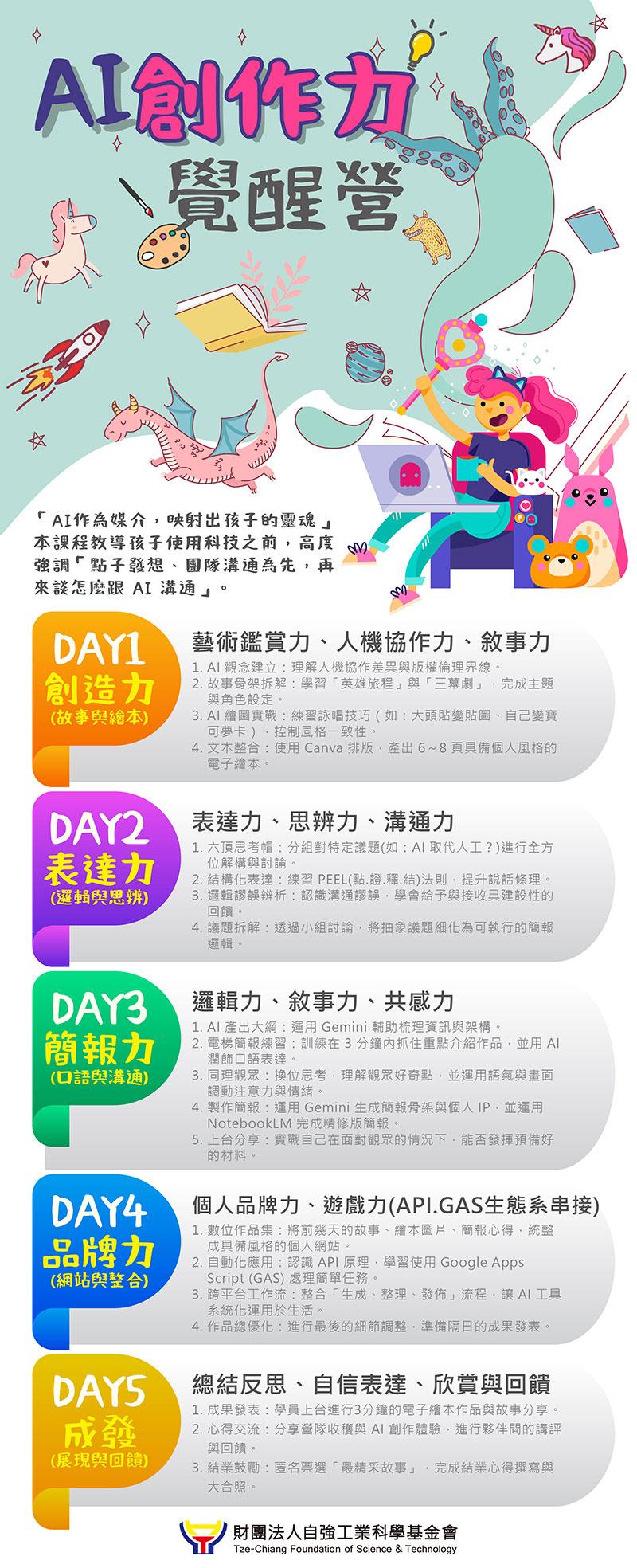 本營隊的核心理念是將 「AI 作為媒介,映射出孩子的靈魂」。營隊在教導孩子使用科技之前,高度強調「點子發想、團隊溝通為先,再來談怎麼跟 AI 溝通」。