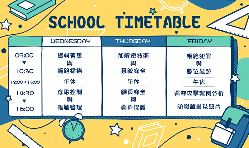 有鑑於當代數位與網路的高速發展,近年來面臨的資安威脅日益嚴重,資訊安全儼然已然成為各產業界急需面臨的問題,根據Fortinet引用的《(ISC)²資安人力研究》,全球資安人力缺口已超過470萬人。本營隊旨在向學生介紹資訊安全的基本概念與實作演練,其內容涵蓋資料蒐集、存取控制與帳號管理、加解密技術與系統安全、網路通訊協定與網路掃描、網站與應用程式安全、資料保護、資安攻擊案例分析及CTF等主題。希望透過理論融合實務案例,讓學生對資訊安全有初步了解,並建立良好的資訊安全意識。
