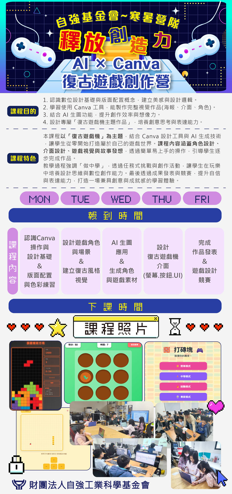 本課程以「復古遊戲機」為主題,結合 Canva 設計工具與 AI 生成技術,讓學生從零開始打造屬於自己的遊戲世界。課程內容涵蓋角色設計、介面設計、遊戲視覺與故事發想,透過簡單易上手的操作,引導學生逐步完成作品。