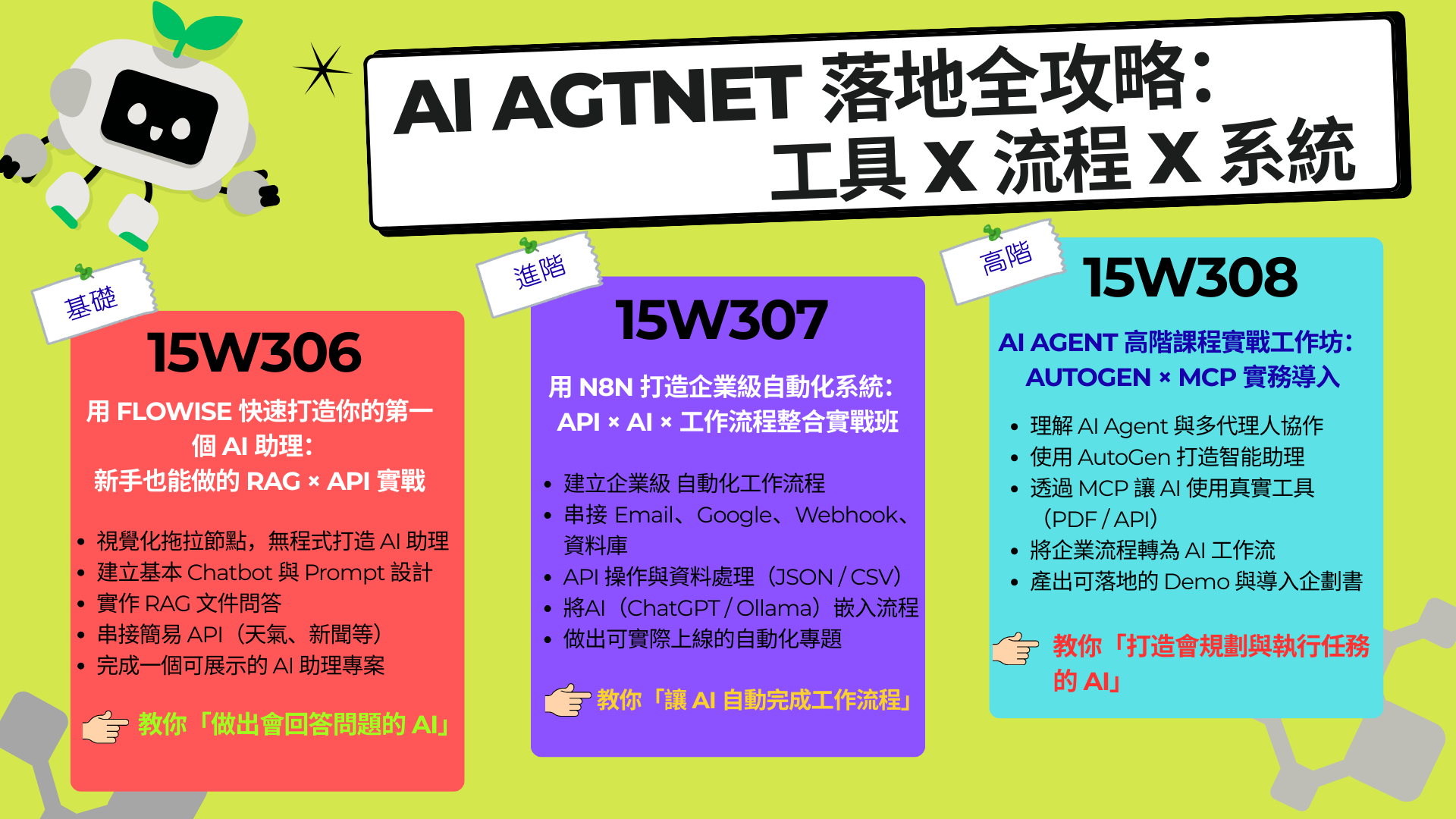 | 15W308 | AI Agent 高階課程實戰工作坊:AutoGen × MCP 實務導入 | 115/5/17、5/24 週日,09:00-16:00 |