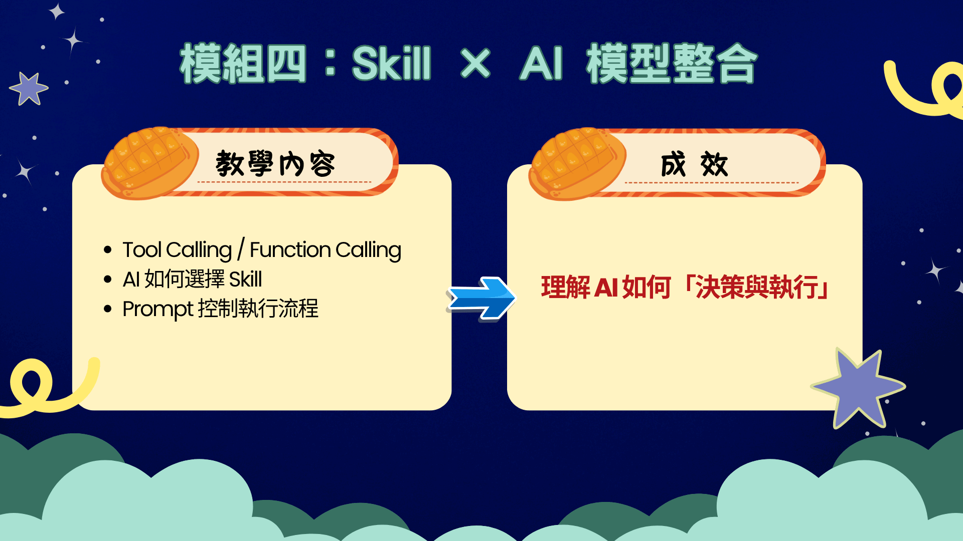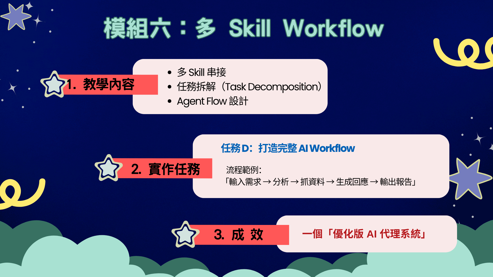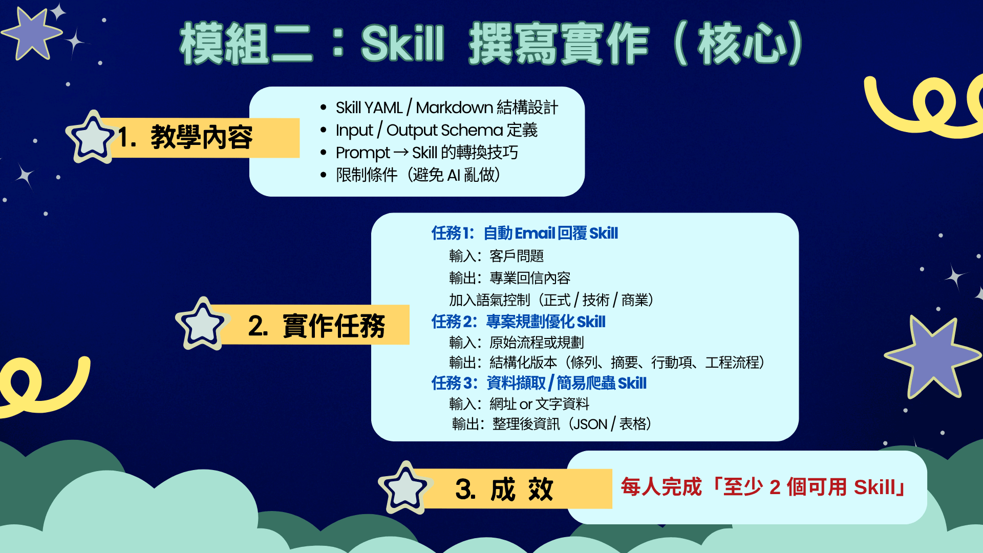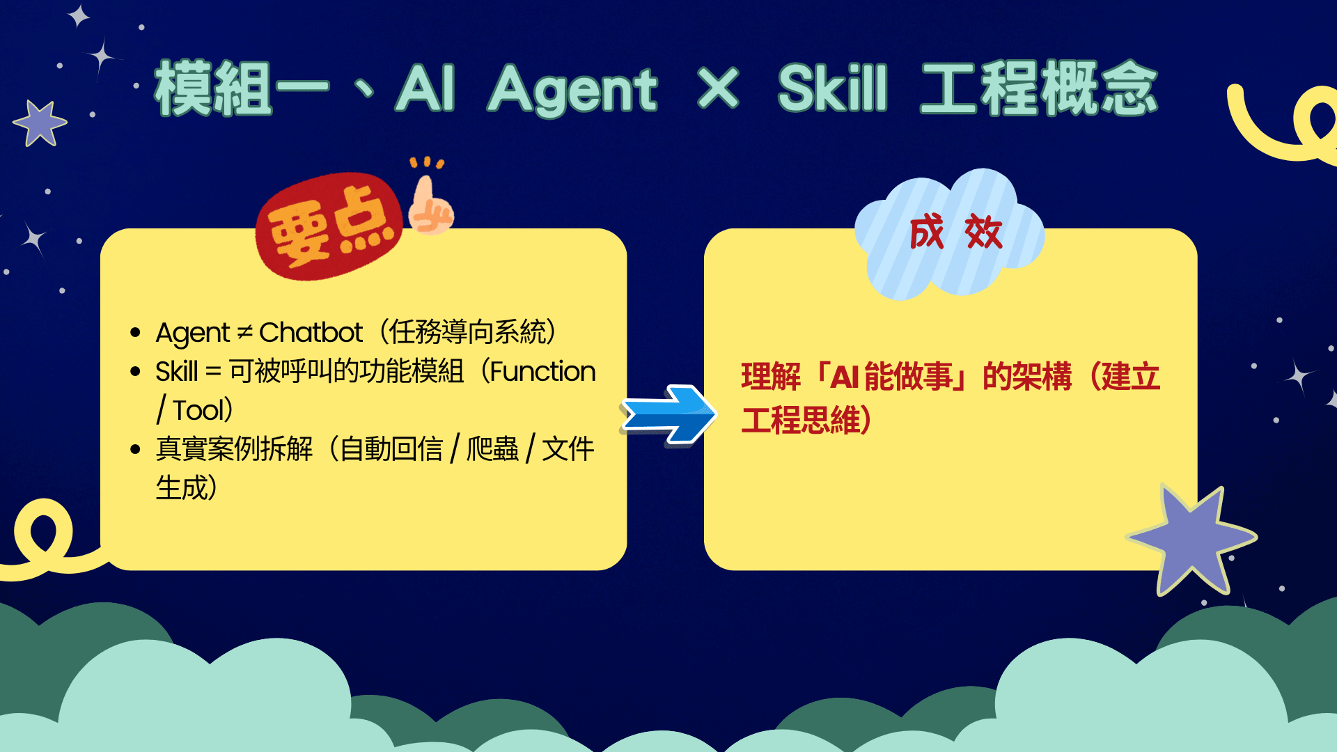🎯 本課程以「做出能用的 AI 工具」為核心,帶領學員從 Skill 撰寫到實際部署執行,完成一套可落地的 AI Agent 工作流程。